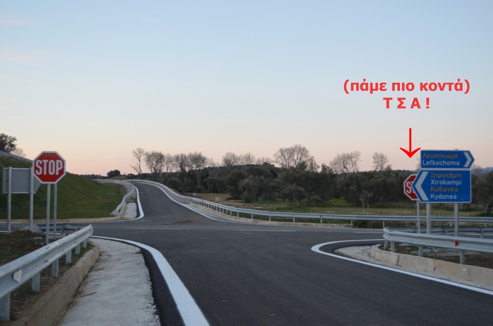 πινακίδες με τα βέλη σήμανσης προς Ξηροκάμπι/Κυδωνιά και Λευκόχωμα*Για να λέμε και του στραβού το δίκιο πάντως, επειδή ο κίνδυνος σύγκρουσης ήταν μεγάλος, πρόσφατα τοποθετήθηκε και στην αριστερή πλευρά του δρόμου ένα stop. Η απορία βέβαια παραμένει: Ποια η χρησιμότητα του δεξιού stop, αφού καλύπτεται πλήρως από την υπόλοιπη σήμανση; Μήπως κάτι απ΄ όλα θα έπρεπε να μετακινηθεί;